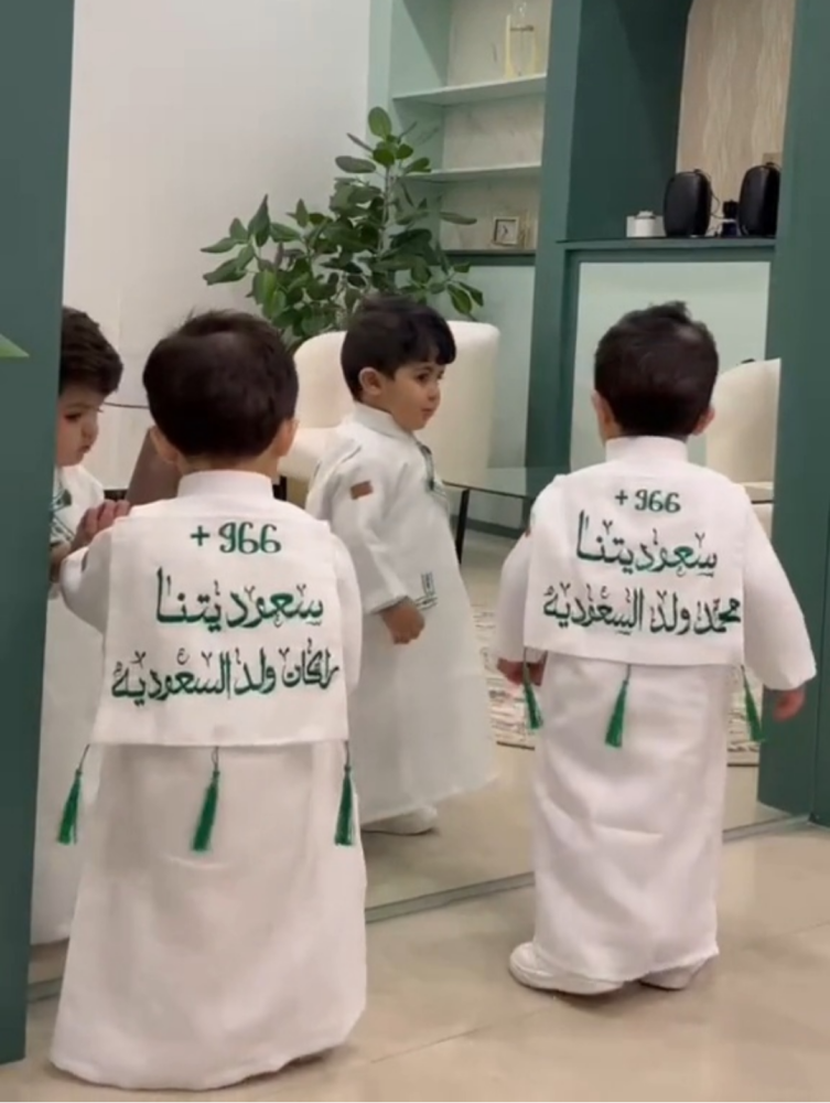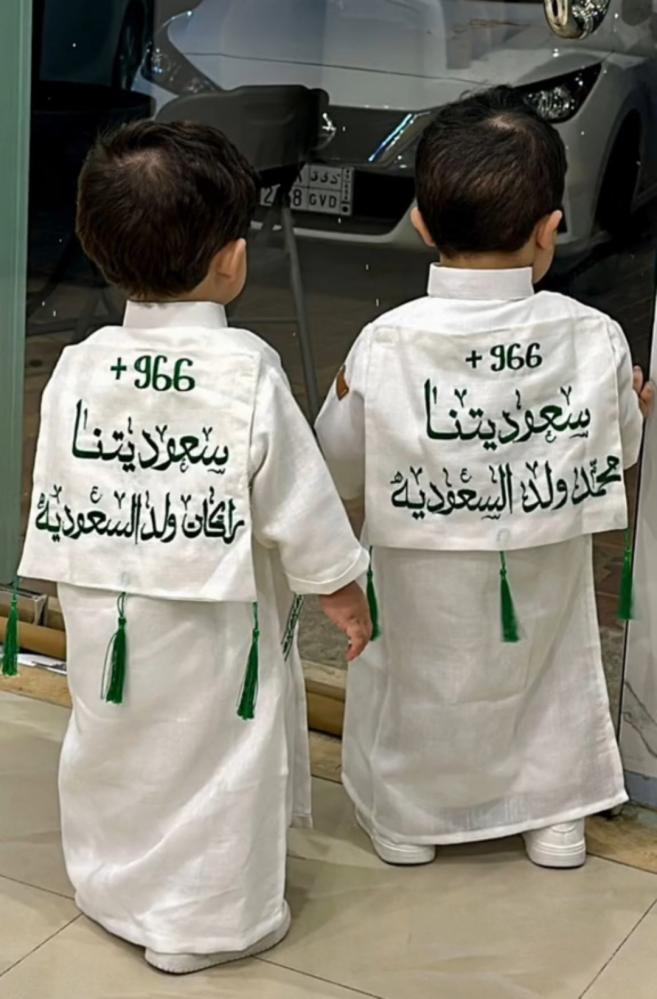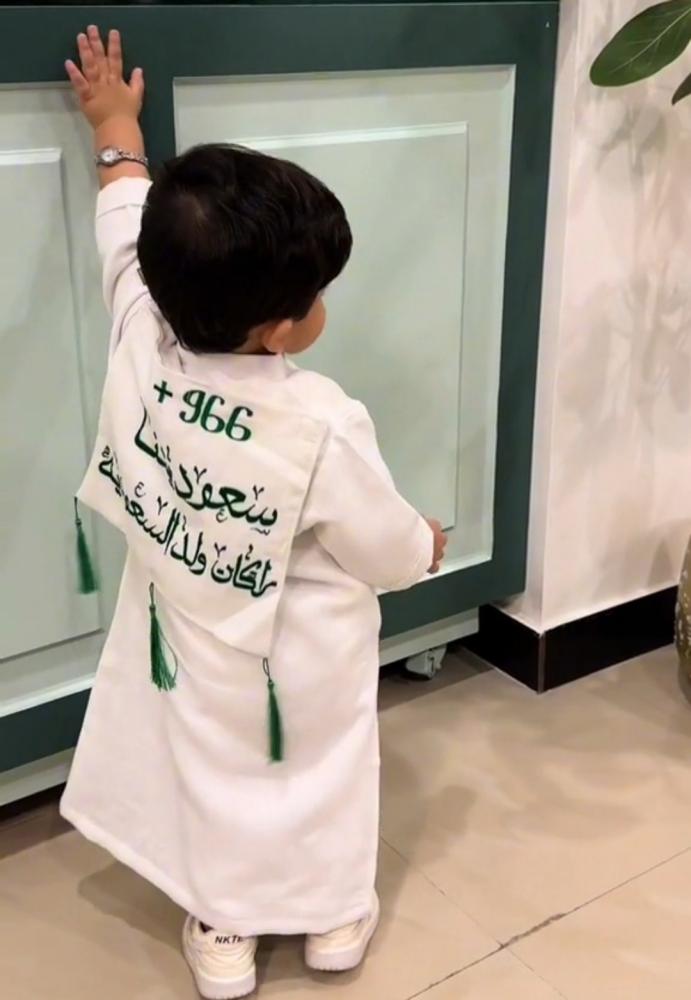 دقلة أطفال بيضاء للاحتفال باليوم الوطني ٩٤عامتصميم مميز: يجمع بين الطابع التقليدي والعصري، مع تطريزات خضراء مستوحاة من العلم السعودي.