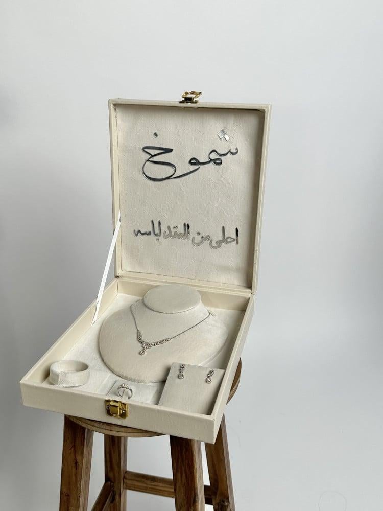 بوكس لطقم الذهب لمناسبة ملكة او زواج او عقد قران او حتى هدية قيمة ..البوكس باللون السكري المخمل ..الكتابه ليست دائمة .. بإمكانك ازالتها ..وهذه أمر جيد .. حتى يمكنك استخدامها عدة مرات او إهدائها ,,بإمكانك اختيار لون الكتابه ( ذهبي - فضي ) .